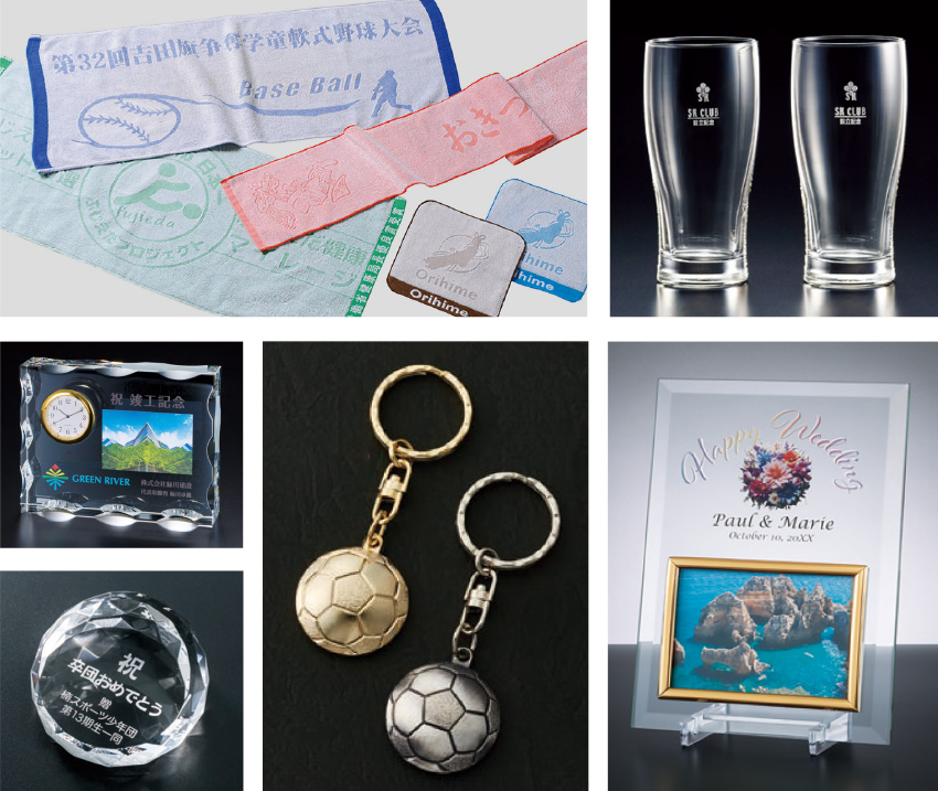 フォトスタンド・置時計・グラス・タオルなど。式典やイベント、販促品として喜ばれる商品。